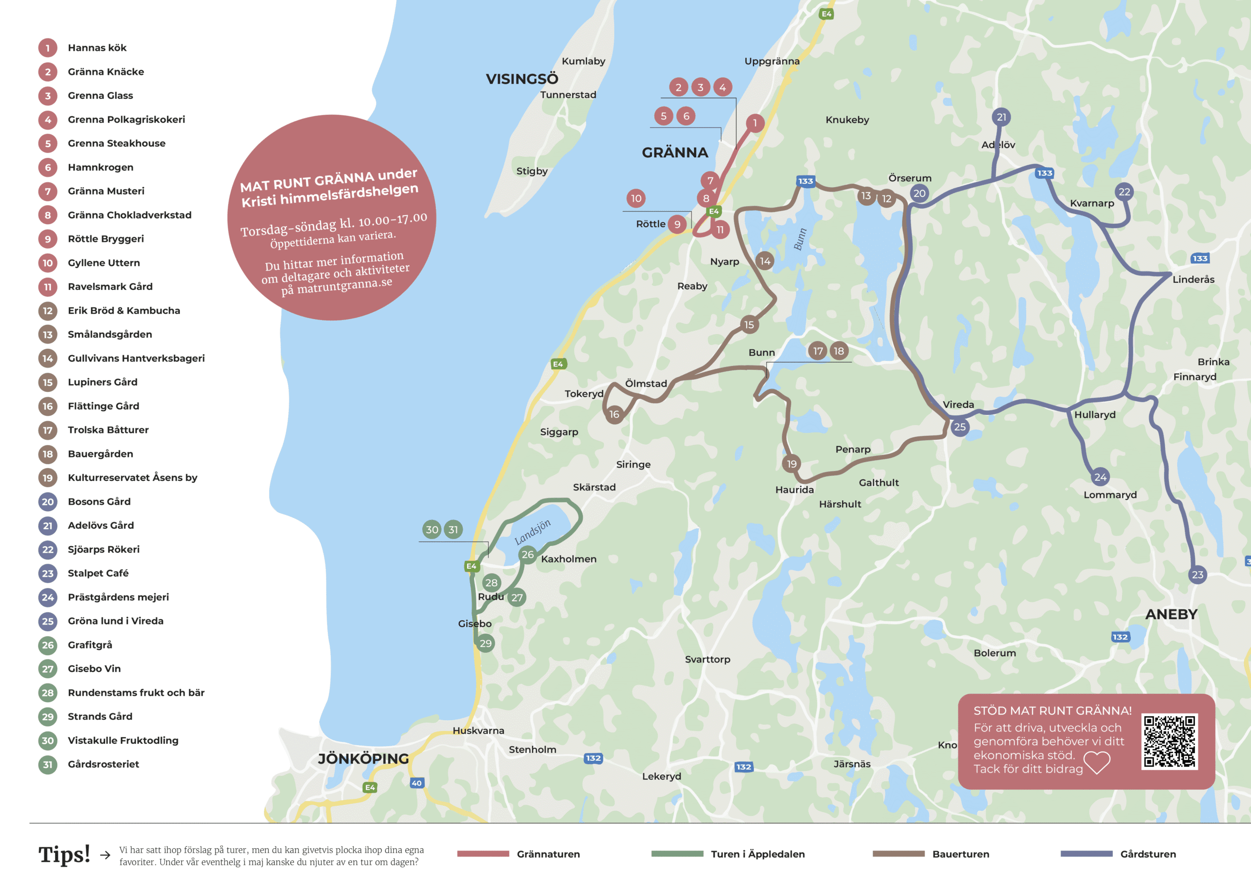 Här hittar du mysiga gårdsbutiker, trädgårdscaféer, restauranger, upplevelser och boendeanläggingar som står redo att visa dig det bästa av Mat runt Gränna!